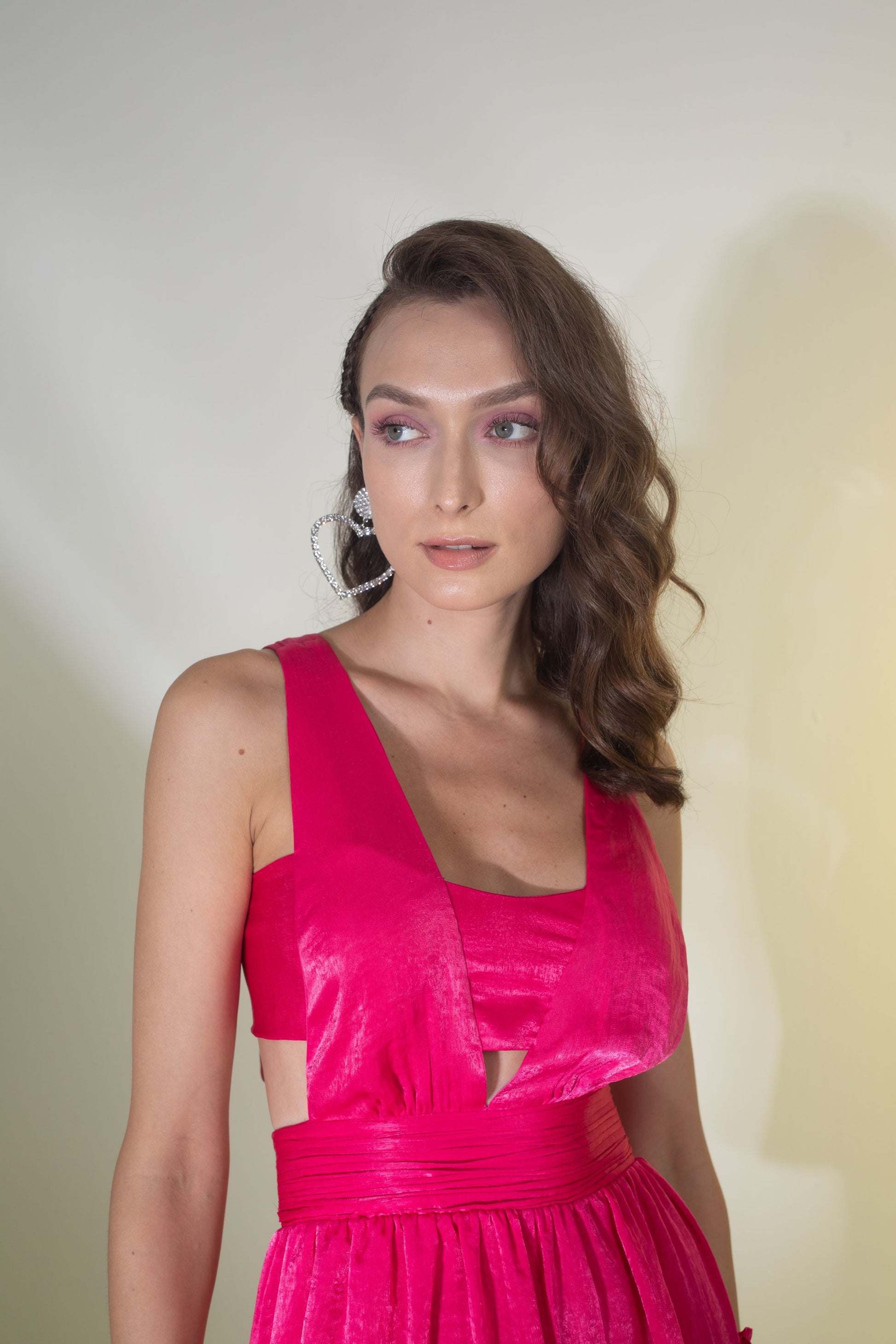 fully lined ruched waist band v neckline with back tie up hidden side zipper closure