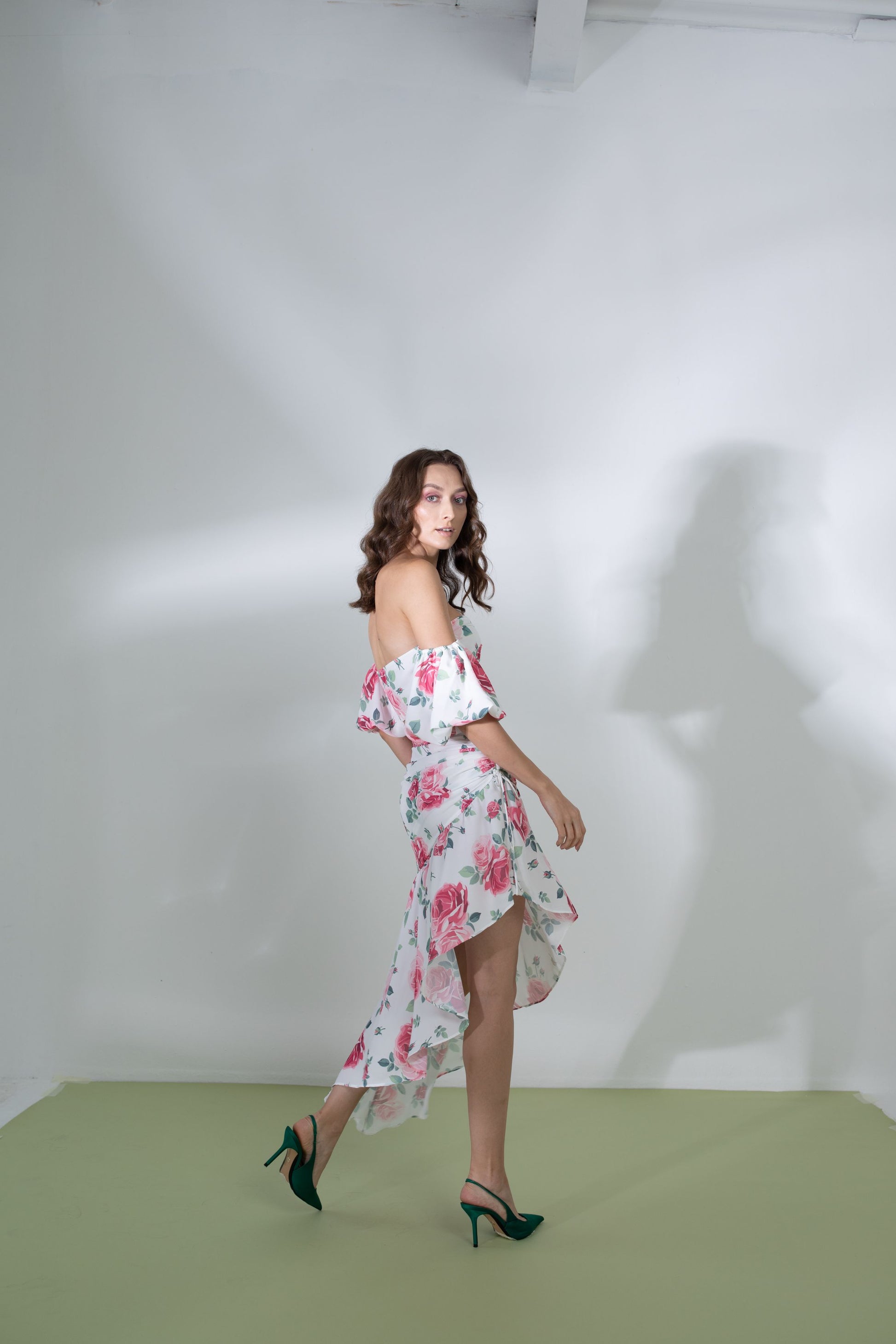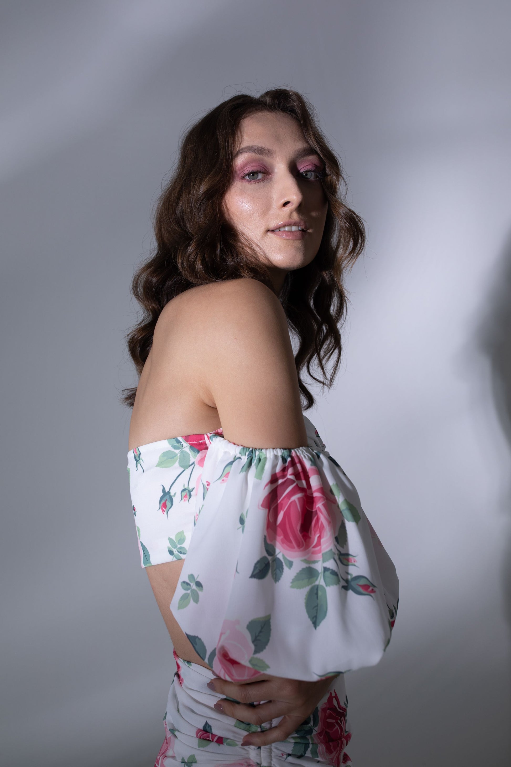 fully lined voluminious off shoulder sleeve bodice gathered at the centre front hidden side zipper closure
