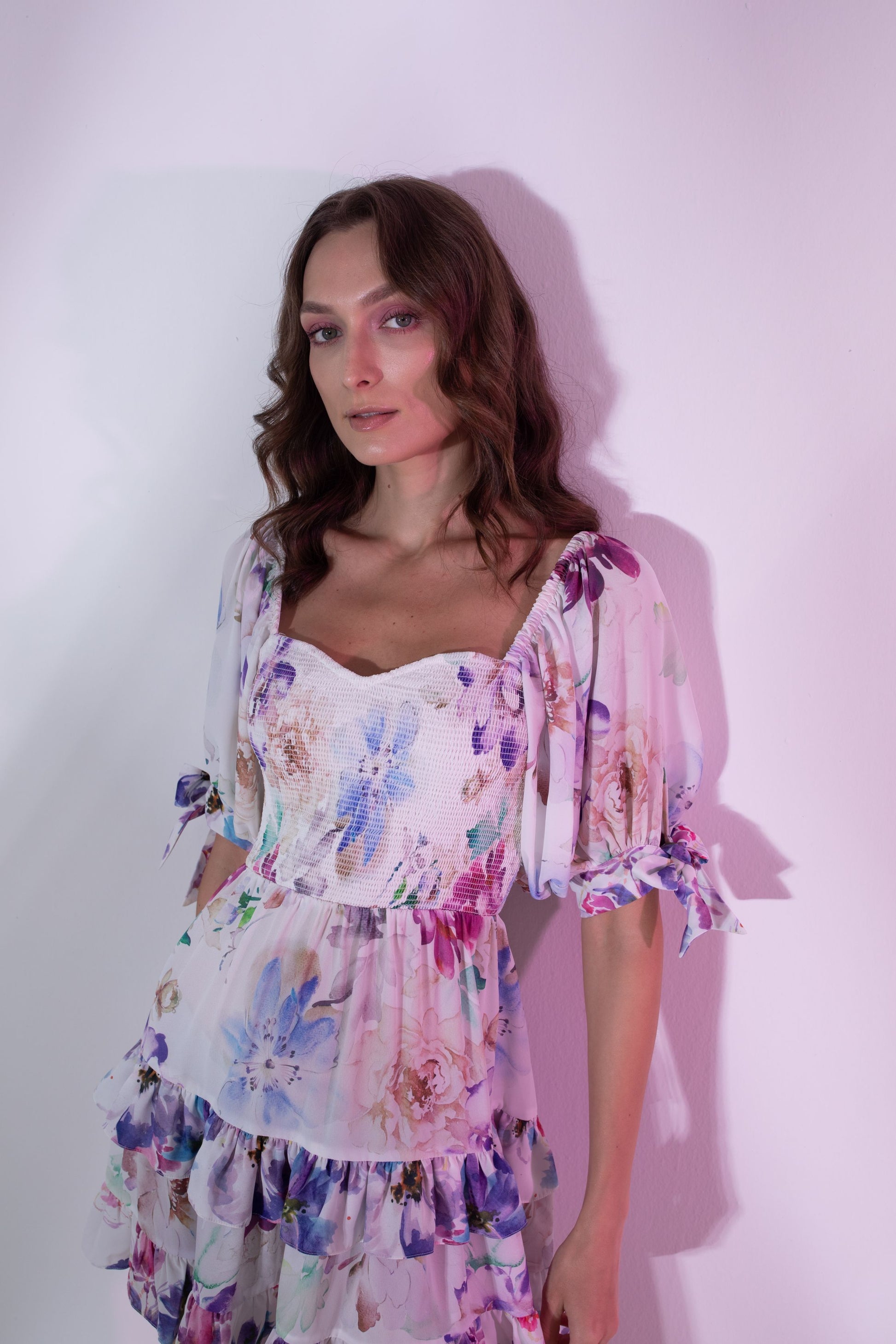smocked body with sweetheart neckline voluminious sleeve with tie up skirt detailed with frill